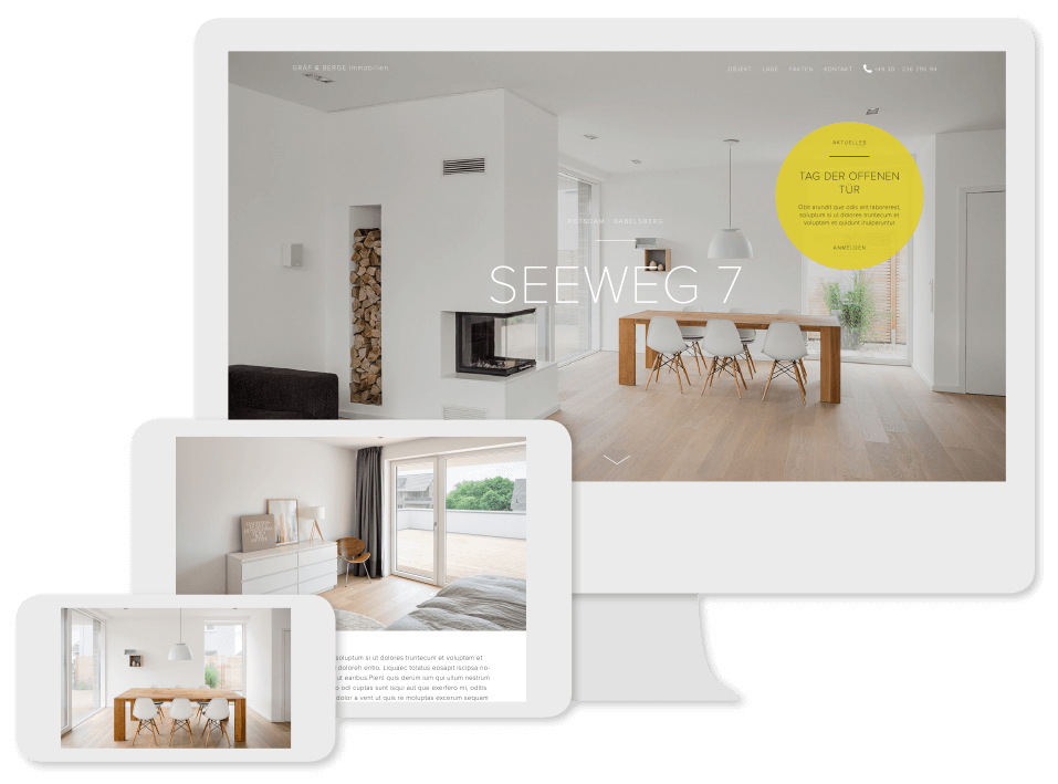 Immer häufiger suchen potentielle Immobilien Käufer über soziale Medien auf ihrem Smartphone oder ihrem Tablet nach Immobilien. Deshalb lohnt es sich, für einzelne Immobilienprojekte als Makler oder Projektentwickler eine eigene Immobilien Homepage oder Immobilien Website zu erstellen, die für Mobil Geräte wie Smartphone oder Tablet optimiert ist. Alle Immobilien Vorlagen von Digimakler sind mobile friendly im Responsive Design aufgesetzt und passen sich automatisch den unterschiedlichen Bildschirmgrößen verschiedener Endgeräte an. Mit Hilfe von Digimakler hebt sich somit Ihre Immobilien Website oder Ihre Immobilien Homepage von den Angeboten der Konkurrenz ab. Der Immobilien Homepage Baukasten von Digimakler ist somit nicht nur ein perfektes Makler Tool für Immobilien Makler und Projektentwickler, sondern dient auch der Akquise neuer Immobilien Projekte.