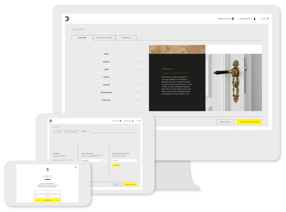 Digimakler ist ein speziell für Immobilienverkäufer konzipierter Website Baukasten: Mithilfe unserer Designs können Sie Ihr Objekt auf einer eigenen Immobilien Homepage bzw. Website präsentieren. Das Digimakler Content-Management-System erlaubt es Ihnen, Fotos, Texte und Grundrisse hochzuladen, Domains hinzuzufügen und Anpassungen vorzunehmen. Um Digimakler nutzen zu können, brauchen Sie weder einen Designer noch einen Programmierer.