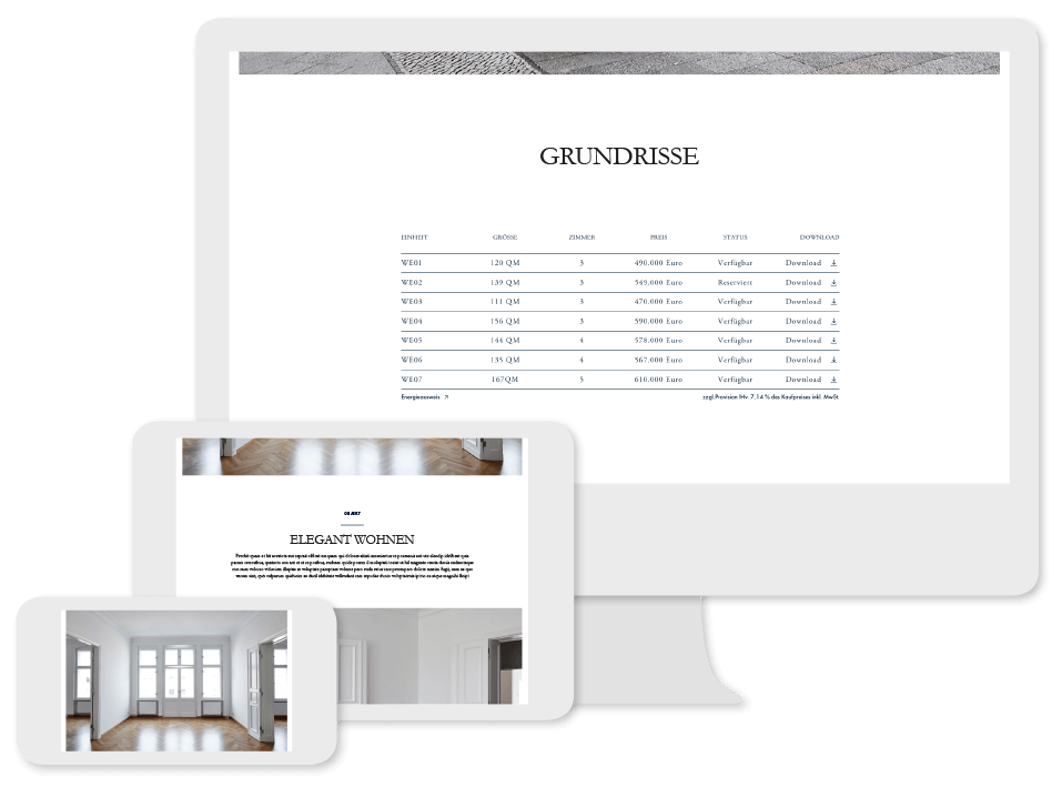 Der Digimakler Website bzw. Homepage Baukasten bietet alles, was Sie für die Vermarktung einer Immobilie brauchen: Sie können Grundrisse in übersichtlichen Listen darstellen, Sie können einen Energieausweis hinterlegen oder Kontaktdaten per OpenImmo-Schnittstelle direkt in Ihr CMS importieren.